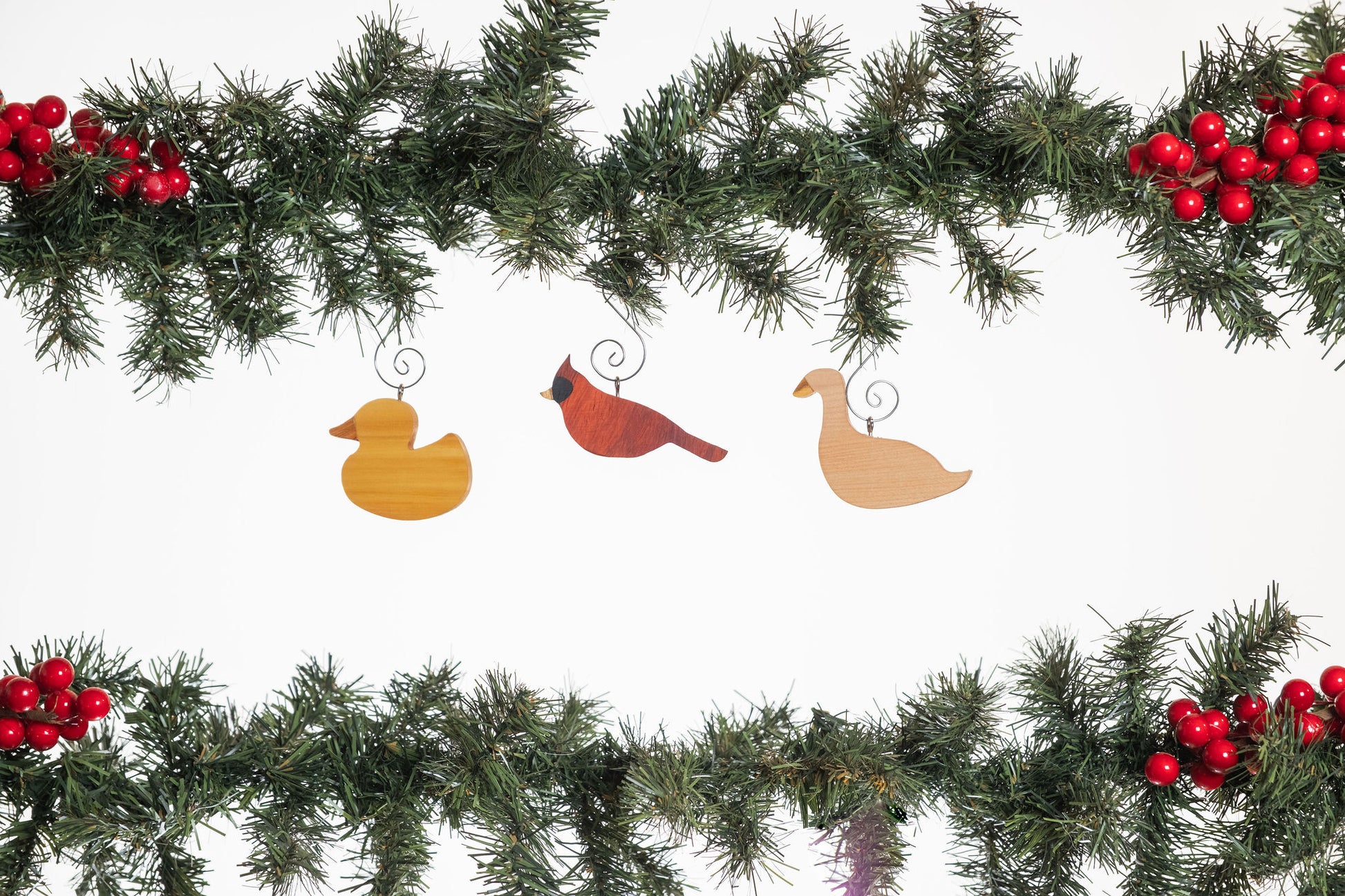 These slab ornaments are made using Poplar and Osage Orange, and are cut out and then shaped and sanded by hand. Crafted with care and skill, our ornaments are adorned with nickel-plated hooks and eyelets, ensuring durability and a touch of elegance (hooks included).