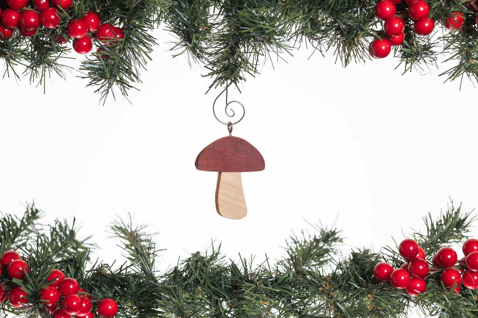 These slab ornaments are made using Padauk for the Mushroom Head and Maple for the stem. These are cut out and then shaped and sanded by hand. Crafted with care and skill, our ornaments are adorned with nickel-plated hooks and eyelets, ensuring durability and a touch of elegance (hooks included).