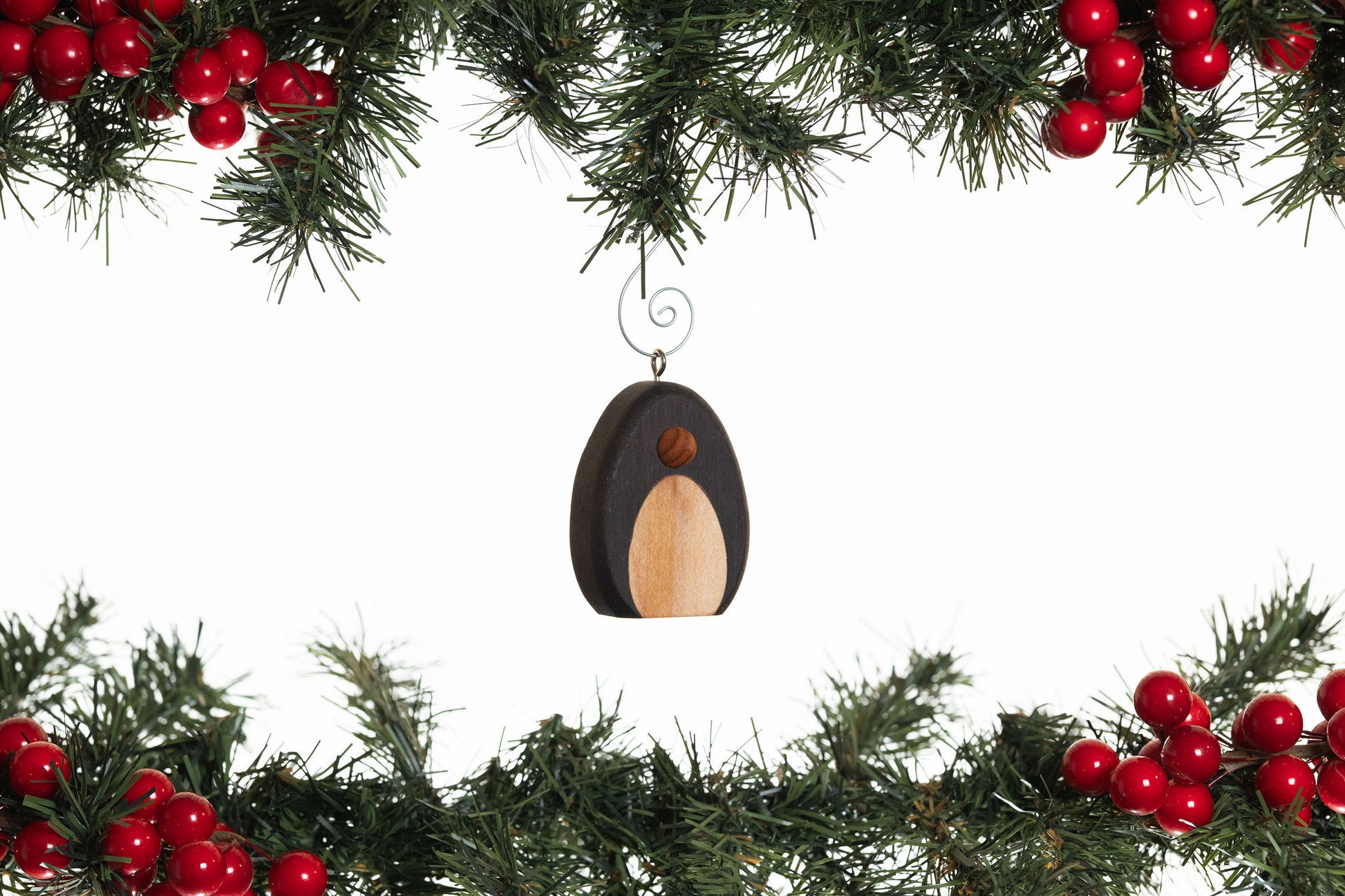Our Penguins are made from a Walnut body and maple inlaid belly, with a turned beak made of Osage Orange. These are cut out and then shaped and sanded by hand. Crafted with care and skill, our ornaments are adorned with nickel-plated hooks and eyelets, ensuring durability and a touch of elegance (hooks included).