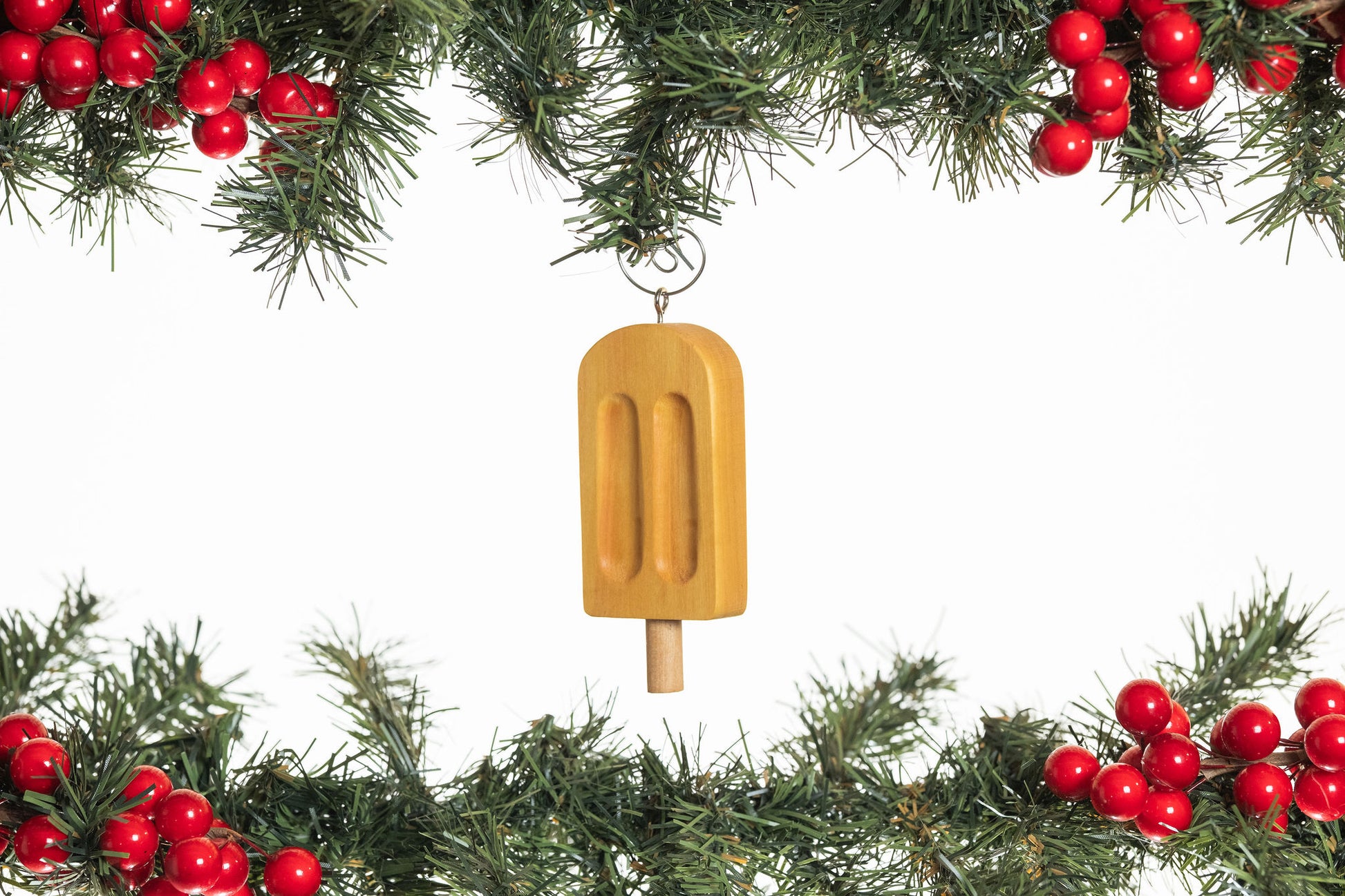 These ornaments are made using Yellowheart for the Popsicle and Maple "popsicle" stick. These are cut out and then shaped and sanded by hand. Crafted with care and skill, our ornaments are adorned with nickel-plated hooks and eyelets, ensuring durability and a touch of elegance (hooks included).